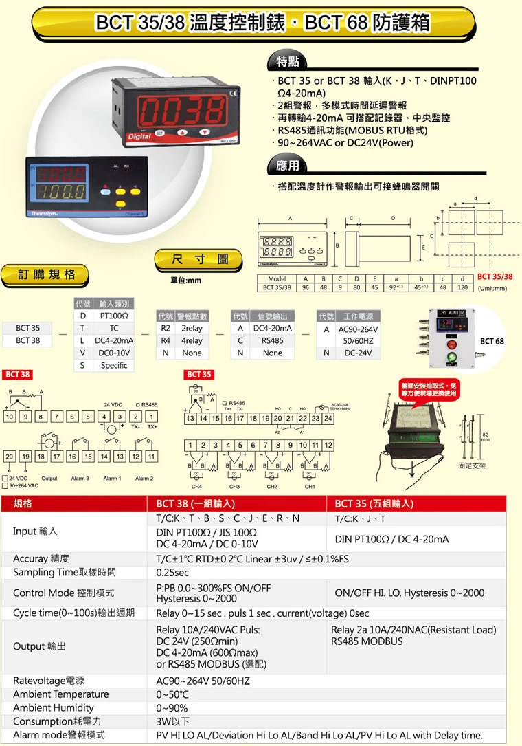 BCT 35/38溫度控制錶可連接輸入K , J , T type PT100Ω溫度訊號 及 類比線性 4-